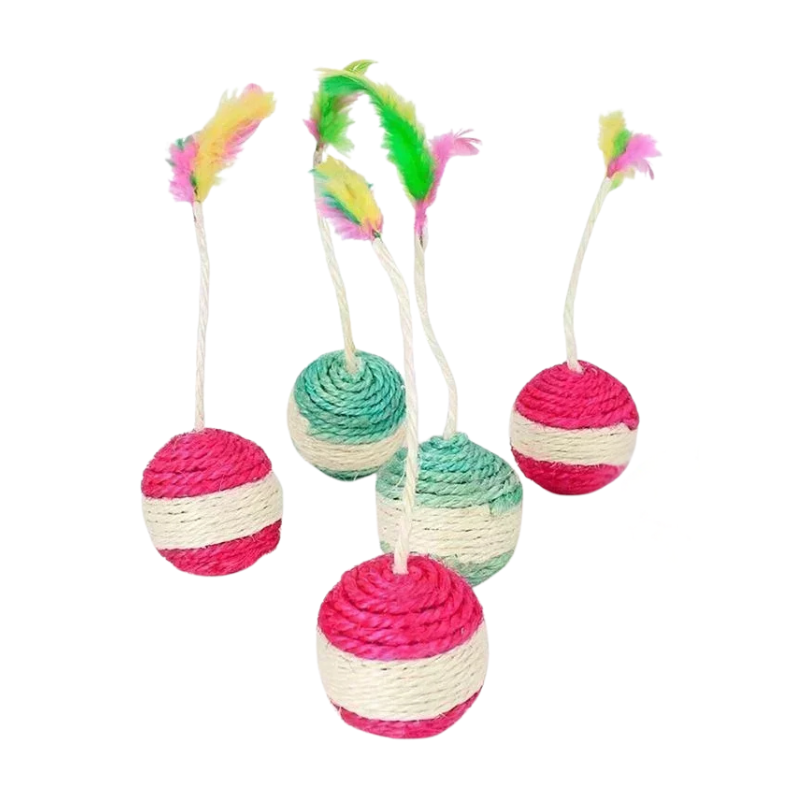Hier steckt viel drin – und genau das lieben Katzen! Die Sisalkugel bietet eine robuste Fläche zum Kratzen und hilft dabei, die Krallen in Form zu halten (und deine Möbel zu schonen). Und die Federn? Die sind der Kick! Flauschig, bunt und unberechenbar genug, um jede Jagd spannend zu machen.