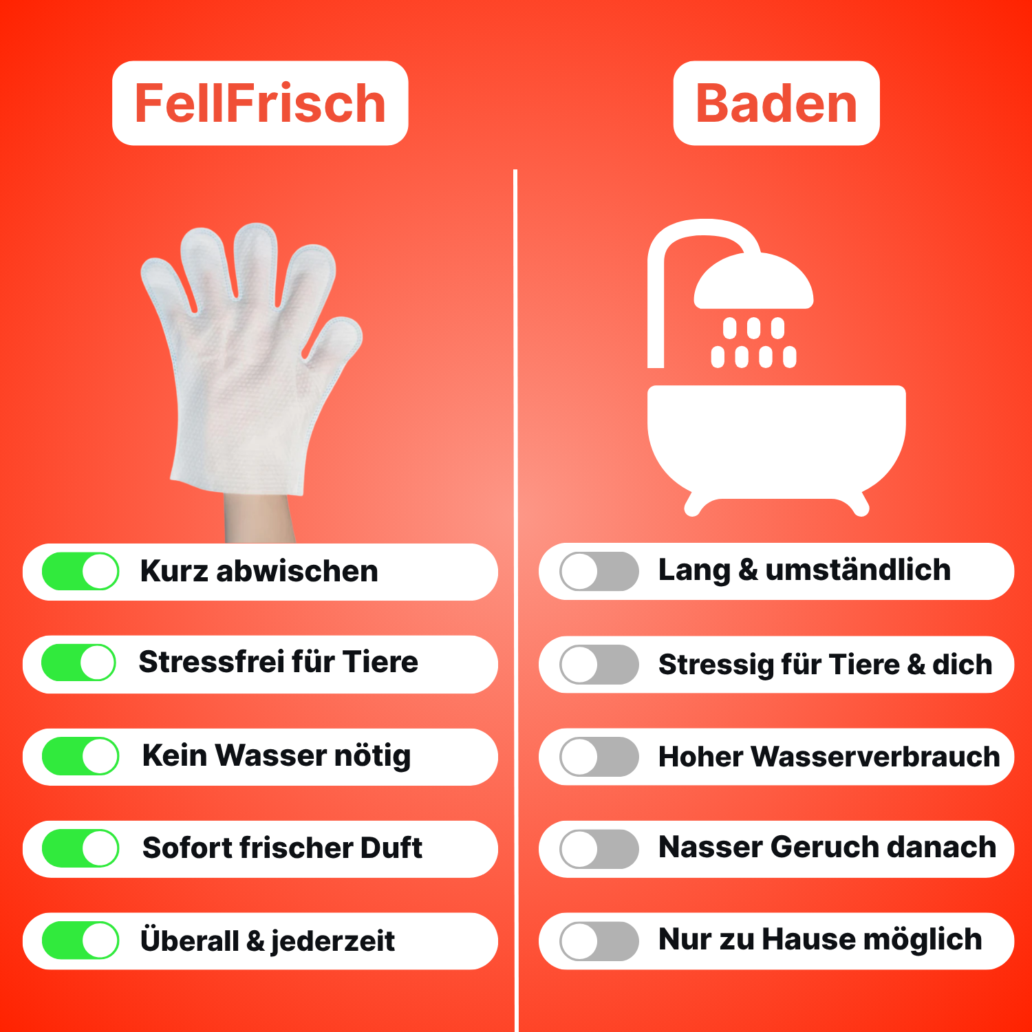 Verabschiede dich von Chaos und Gerüchen mit FellFrisch – der schnellen und unkomplizierten Lösung, um deinen vierbeinigen Freund sauber, glänzend und frisch riechend zu halten. Für mehr Kuschelzeit und selbstbewusste Abenteuer im Freien!
