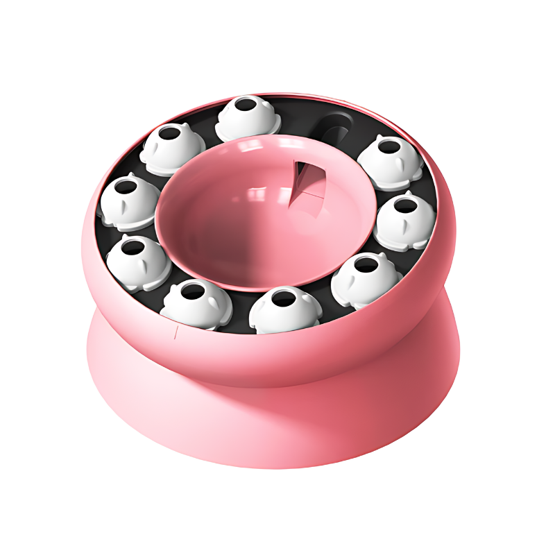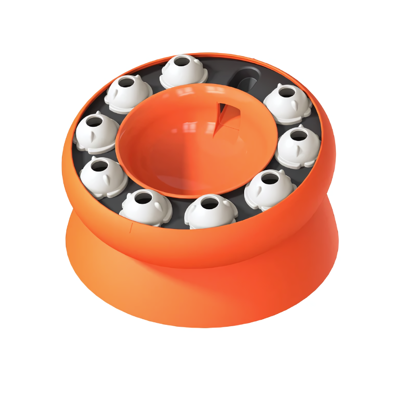 Der SchnurrNapf ist mit neun drehbaren Türmchen ausgestattet, die das Futter herausfordern verstecken. So muss deine Katze sich das Futter spielerisch erarbeiten – das verlangsamt das Fressverhalten um bis zu das Zehnfache! Die Folge: weniger Völlegefühl, kein Erbrechen, bessere Verdauung.